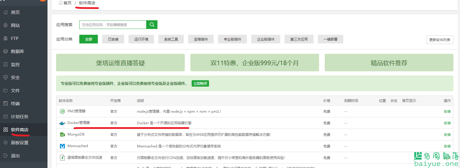 安装好宝塔环境后,打开宝塔面板,软件商店,找到Docker管理器并安装,此步骤需要等待两分钟。