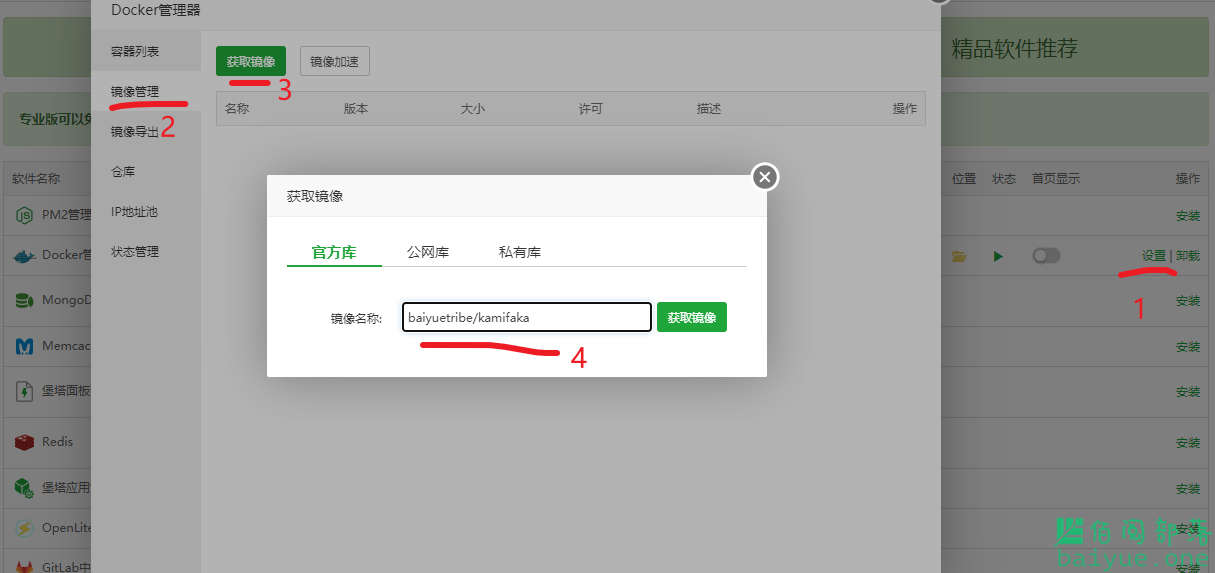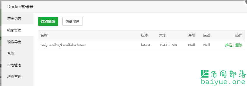 完成后,打开Docker管理器设置,获取镜像,输入baiyuetribe/kamifaka,获取发卡程序镜像。