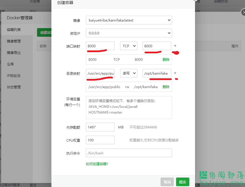 只需要确保红线参数正确即可,端口映射:左侧容器内是固定的8000端口,右侧端口可随意,推荐跟左侧一致。