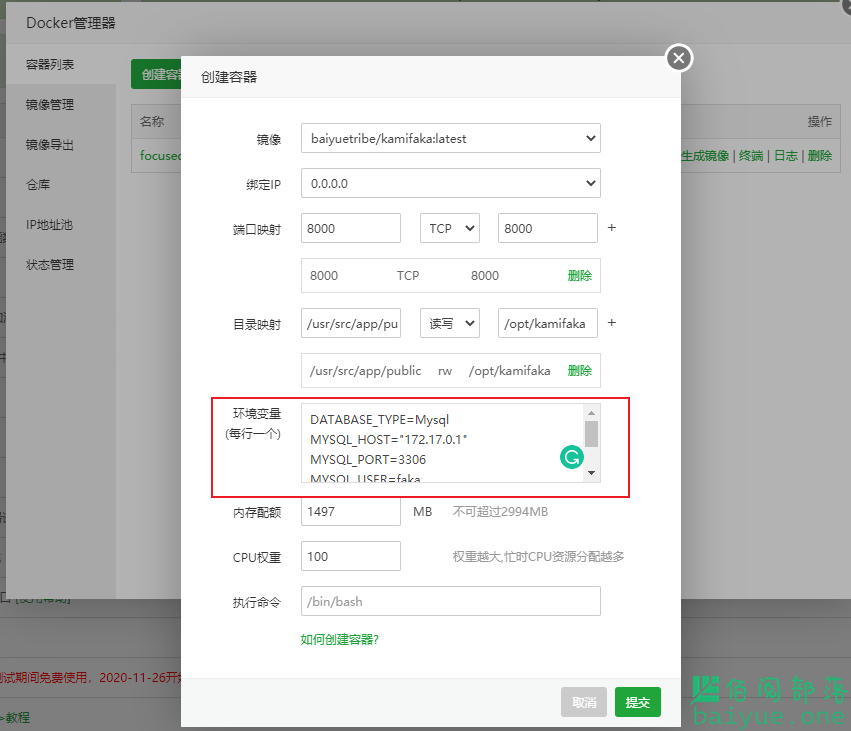 目录映射:作用是容器内公共部分文件目录映射到服务器上,左侧为容器内固定地址/usr/src/app/public,右侧为服务器上可查看的目录地址/opt/kamifaka,常用于数据持久化或备份文件。其余参数保存默认即可。记得填写参数后点下”+”号,否则无效。