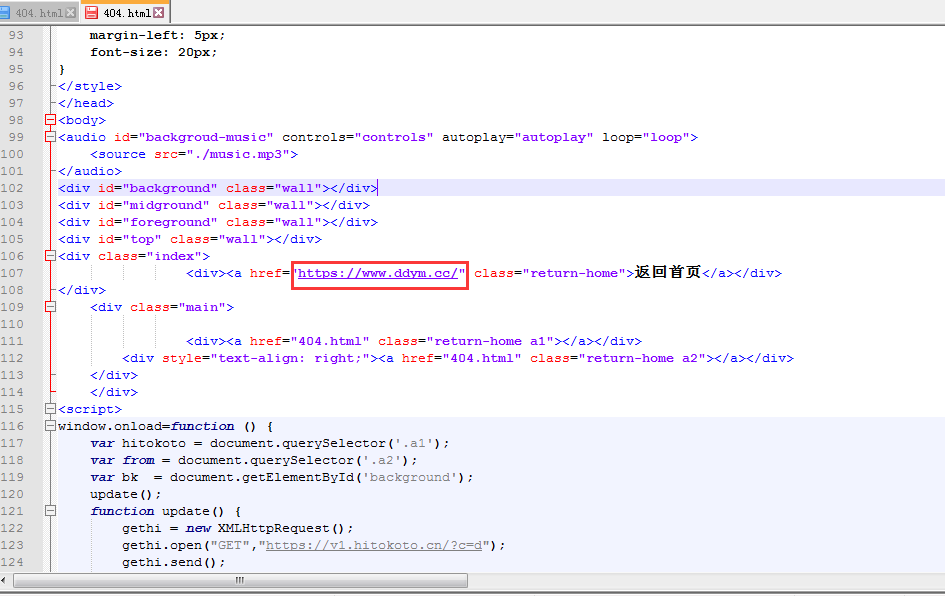 ③:将网站404.html代码框框中的网址107行修改自己的域名,第100行音乐名称/music.mp3可以选择自己喜欢的音乐,保存之后,访问一个 不存在路径