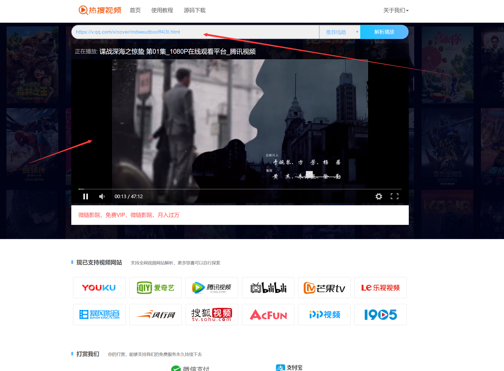 5:解析视频:复制视频地址到你的网站解析,安装之后主页上面有{使用教程}点击查看。