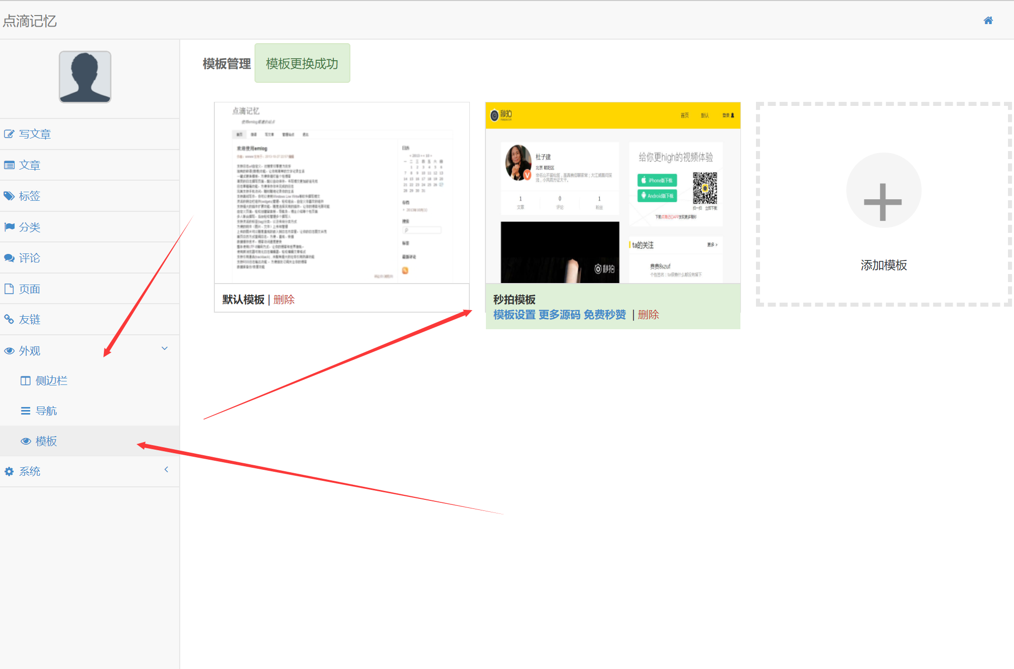 5:更换模板登陆后台-外观-模板-选择自己喜欢的模板上传
