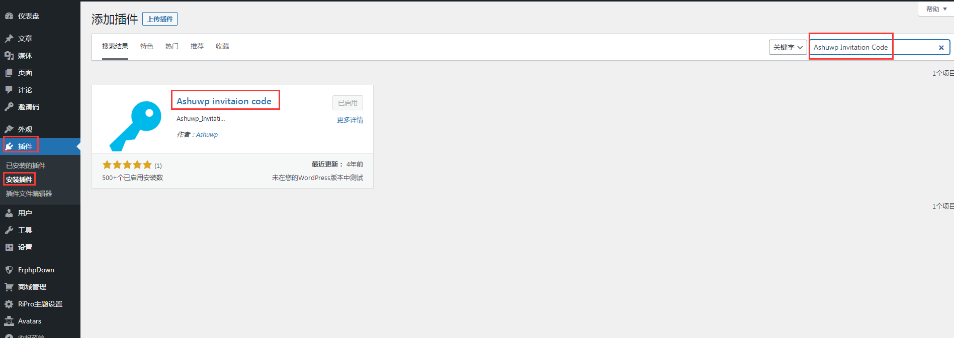 点击“插件”——>“安装插件”,搜索“Ashuwp Invitation Code”即可。前提需要开启用户注册,经测试支持 WordPress 最新版以及 PHP7.0+,大家可放心使用。如果你是会员站,这款插件值得拥有。